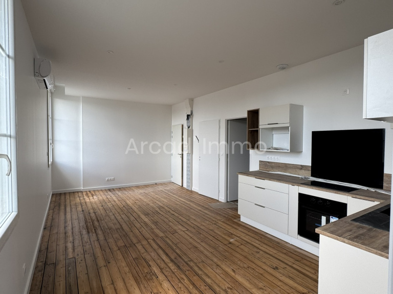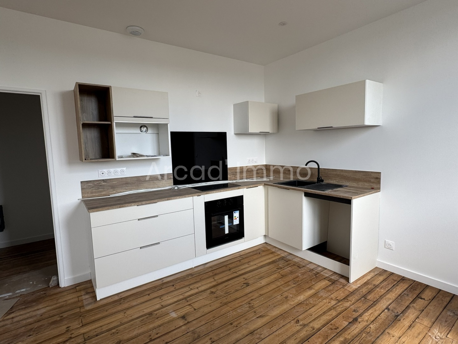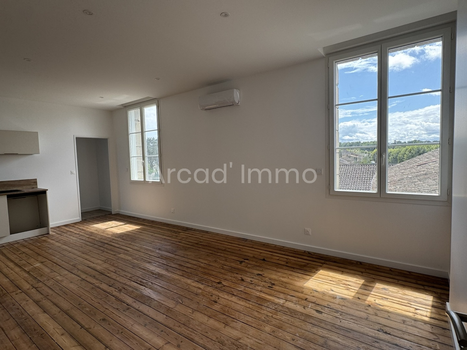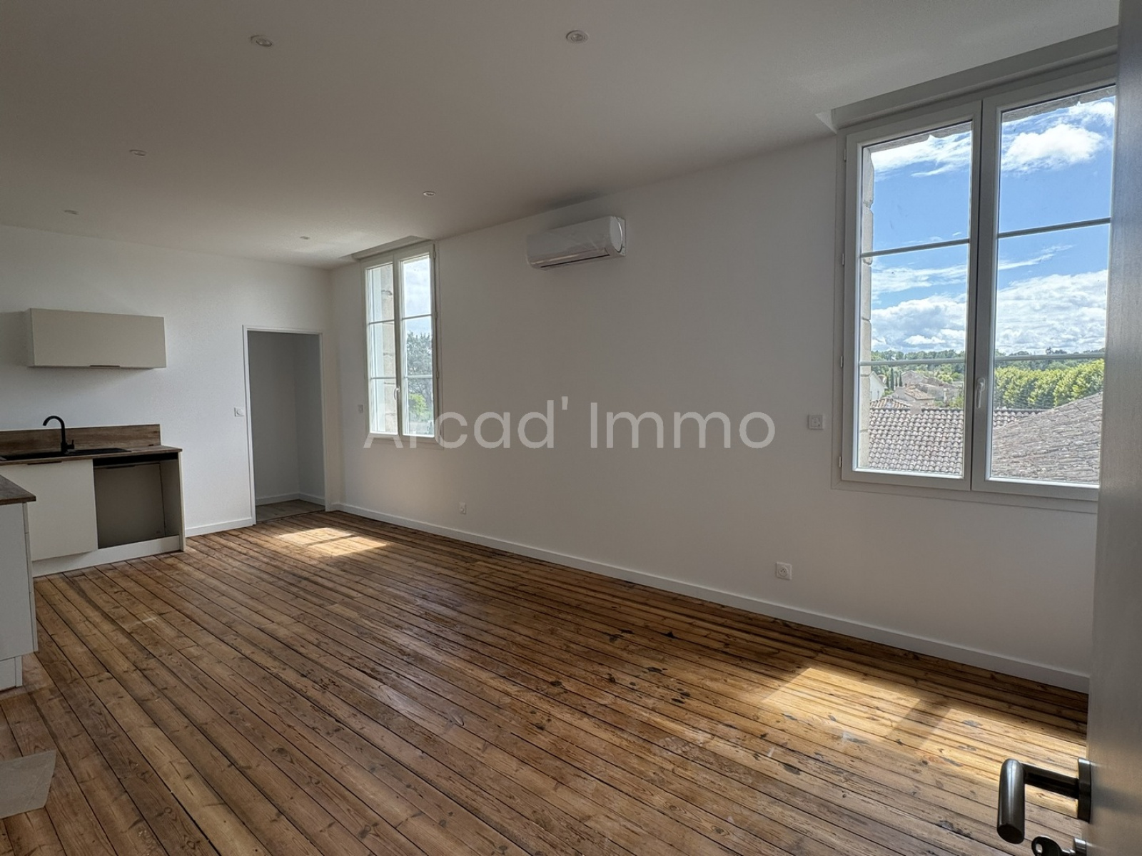 Le séjour/salle à manger (22.2 m²), parquet flottant, deux fenêtres double vitrage PVC, cuisine semi-aménagée et équipée (évier avec mitigeur, plaque induction, four).