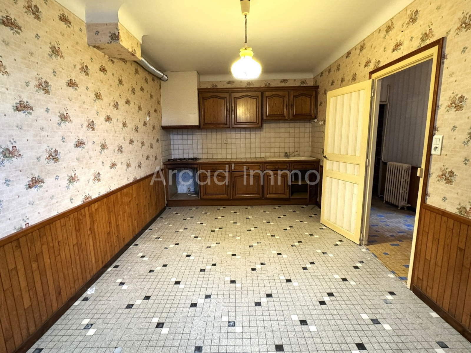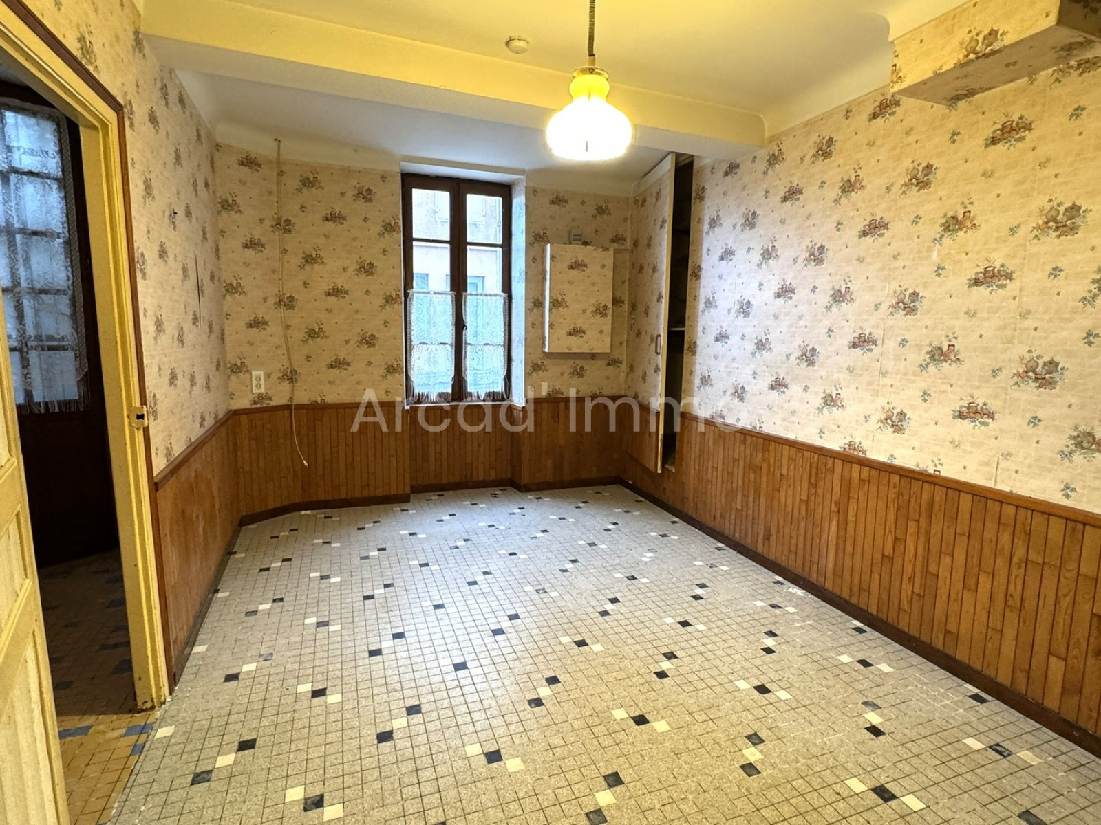 La cuisine (15.5 m²), cloison de séparation entre la cuisine et le hall d’entrée, possible de faire une belle et grande pièce avec beaucoup de luminosité. Grande fenêtre bois, simple vitrage et volets bois.