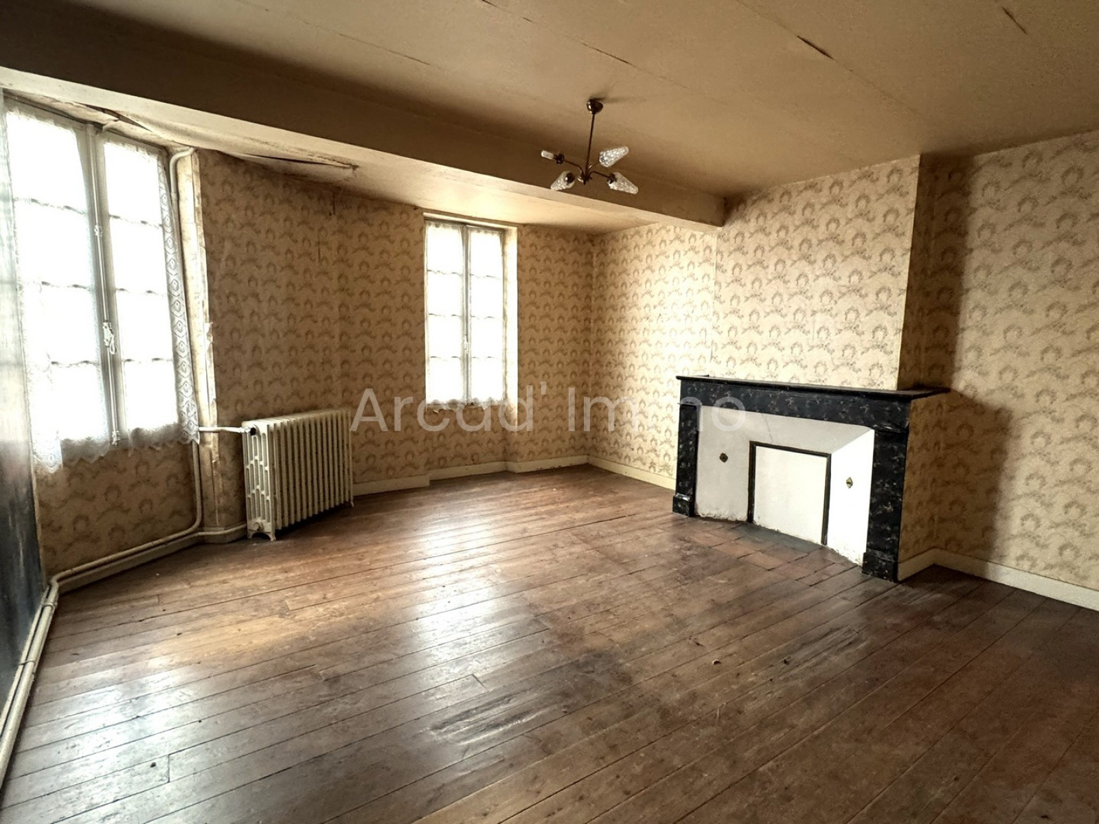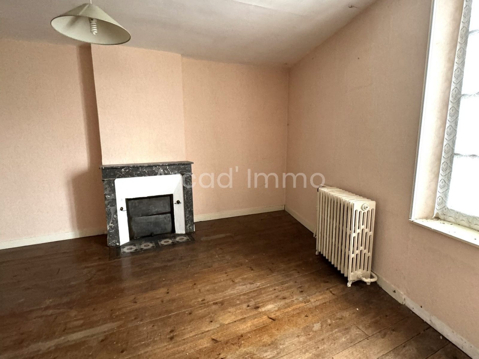 Le séjour (11 m²) cloison de séparation avec le hall d’entrée, possible de faire une belle et grande pièce avec beaucoup de luminosité. Grande fenêtre bois, simple vitrage et volets bois.