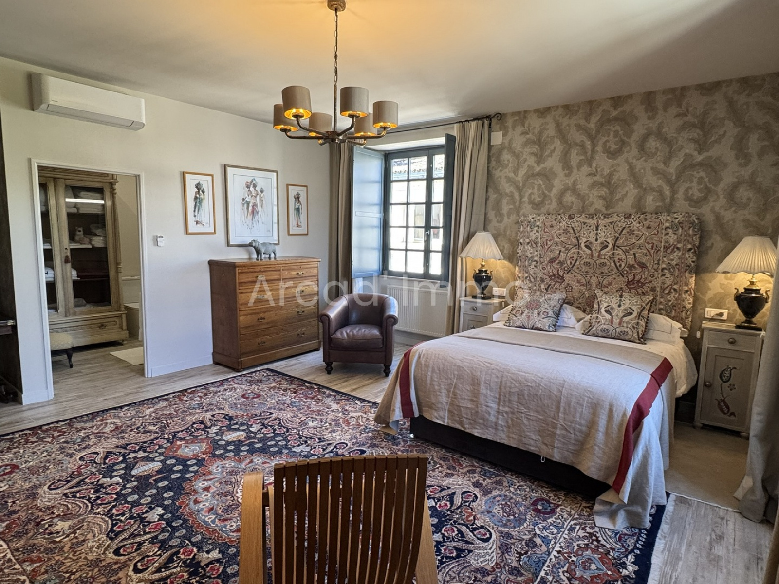 C'est une belle chambre spacieuse avec un mur à colombages, une grande fenêtre à double vitrage orientée à l'est, avec des volets intérieurs et extérieurs, un très grand dressing en chêne fait main, un sol carrelé, un haut plafond, la climatisation réversible et le chauffage central par le grand radiateur thermostatique. Accès par le salon ou par la tour.