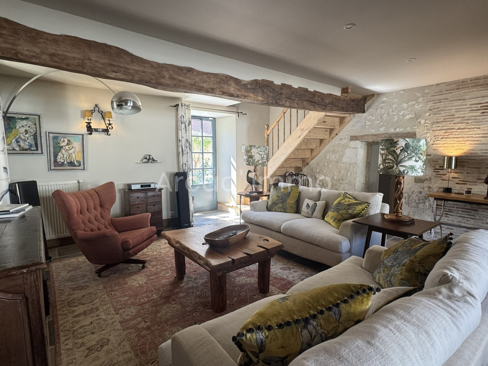 La salle à manger/salon (37,2 m²) avec accès au jardin intérieur, une belle pièce très lumineuse, toutes les fenêtres à double vitrage avec des volets à l'extérieur et à l'intérieur, toutes peintes dans une belle couleur bleu pigeon. Le carrelage est magnifique et toutes les pièces sont équipées d'un chauffage au sol et d'un système de climatisation réversible. Le mur intérieur en pierre avec l'escalier est magnifique, tout comme les deux grandes poutres au plafond.