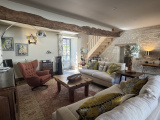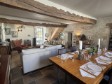 Le salon avec sa cheminée médiévale en pierre et son « feu à l'éthanol » Bricous (39,1 m²), une pièce très lumineuse, un magnifique plafond avec des poutres en chêne peintes avec une peinture blanche de qualité, un sol carrelé et deux grands radiateurs régulés par thermostat.