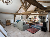 Le salon/salle de réception ouvert, sous les poutres du toit impressionnant de cette propriété médiévale.