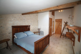 * Une chambre parentale (17 m²), carrelage au sol, un velux, une fenêtre, étagères de rangement, pierres apparentes, une salle de douche (2.30 m²), carrelage au sol, un meuble vasque, une douche, un sèche-serviettes.