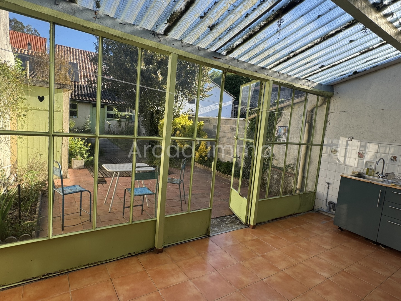 La véranda (14.7 m²) c’est la pièce de vie en plus de la maison, elle a vue dans le jardin. Dans cette véranda il y a un coin cuisine d’été avec un évier avec mitigeur et un meuble de rangement, il y a aussi la chaudière à fuel qu’il faut remettre en route ou remplacer par une pompe à chaleur par exemple.