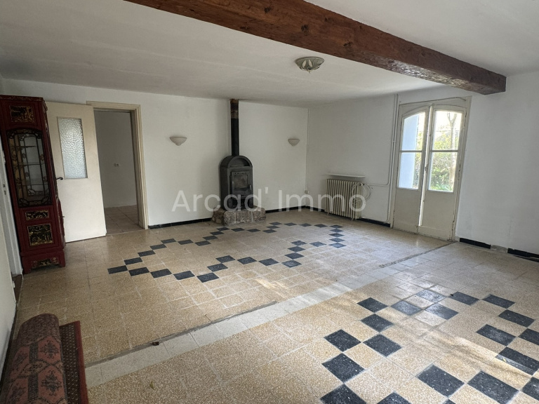 Un grand séjour (31 m²) avec son poêle à bois, carrelage typique des années ‘60/’70 au sol, simple vitrage, porte fenêtre donnant directement dans le jardin, accès à la cuisine et aux chambres.