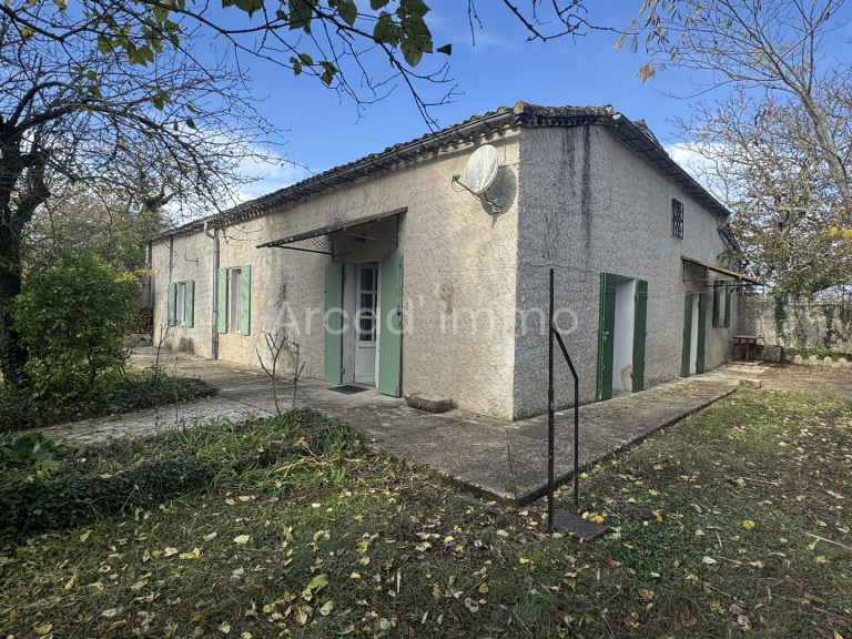 Une cuisine (20 ²m) aménagée avec coin repas, porte vers le jardin et une porte vers l’arrière de la maison avec sa terrasse ombragée.