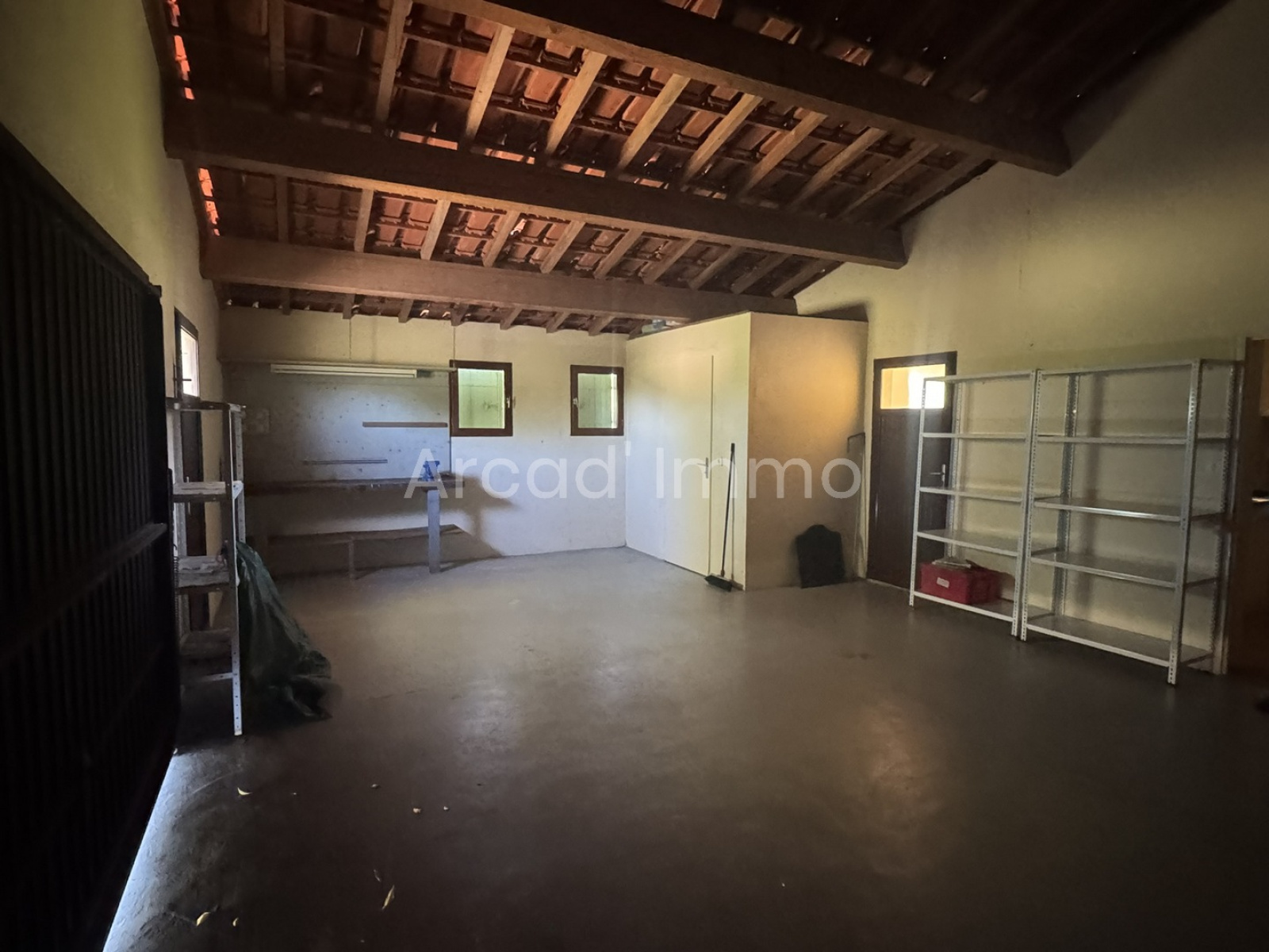Totalement indépendant, le garage en tôle d’env. 28 m² sol terre, endroit idéal pour le matériel de jardinage et le stockage de bois de chauffage.