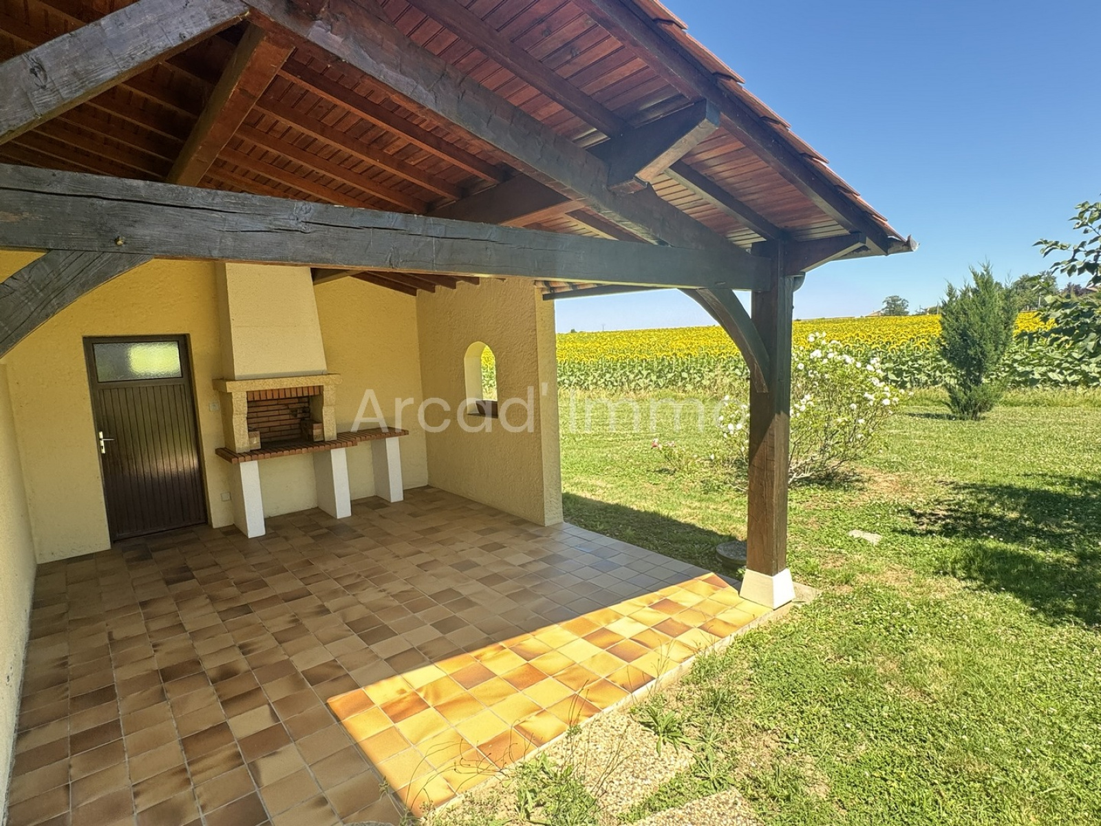 La terrasse couverte avec son barbecue (20 m²), carrelage au sol.
