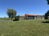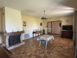 Le séjour avec sa cheminée/insert (27.15 m²) carrelage au sol, double vitrage PVC, volet bois repeints en 2024.