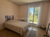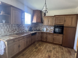 La cuisine (12.10 m²) entièrement aménagée et équipée (four, plaque au gaz, lave-vaisselle) carrelage au sol, porte-fenêtre donnant sur la terrasse couverte et le coin barbecue.