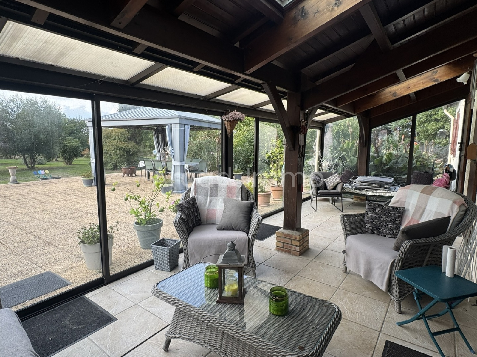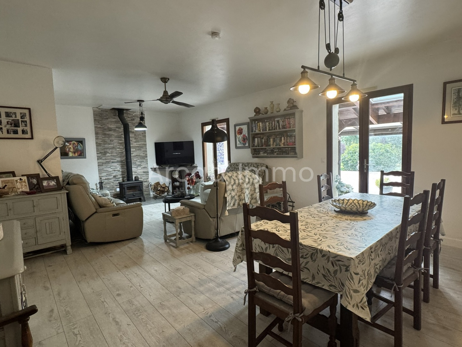 Un grand séjour/salle à manger (34.2 m²) carrelage au sol, poêle à bois, convecteurs, portes-fenêtres donnant sur la véranda qui donne accès à la terrasse et vue dans le beau parc arboré.