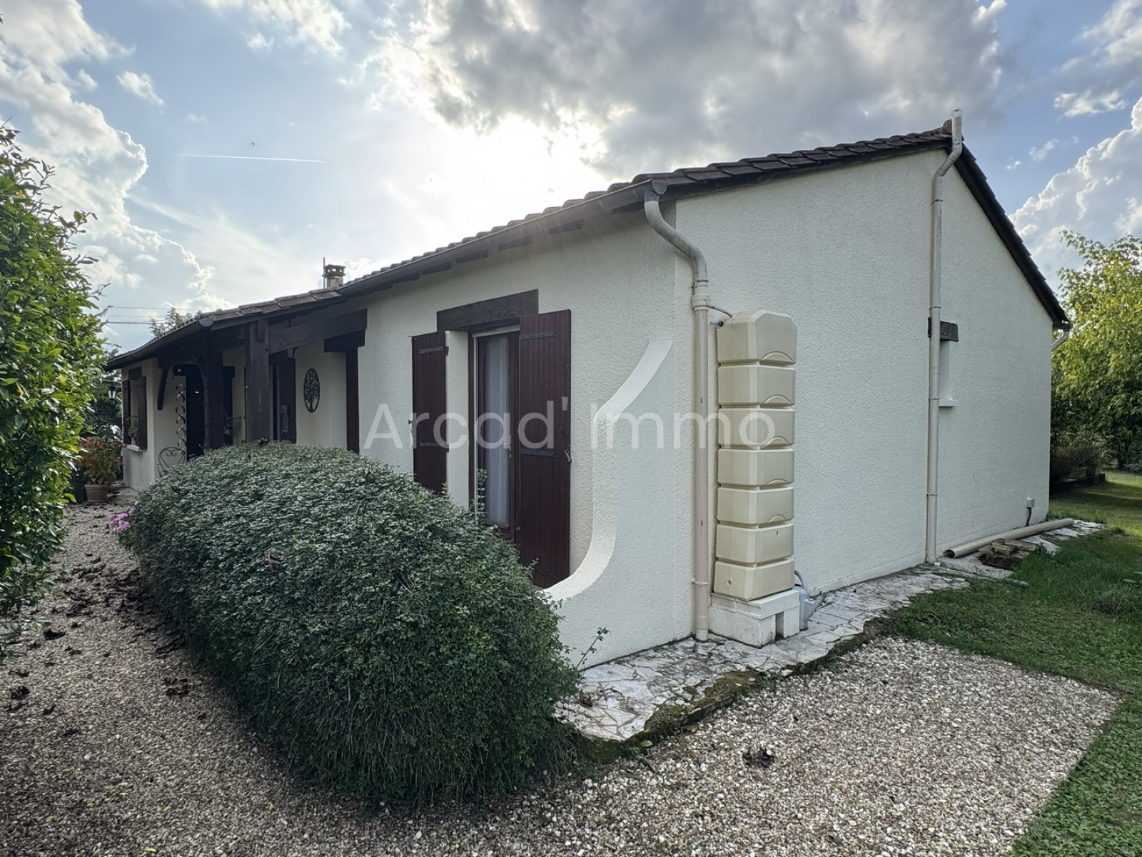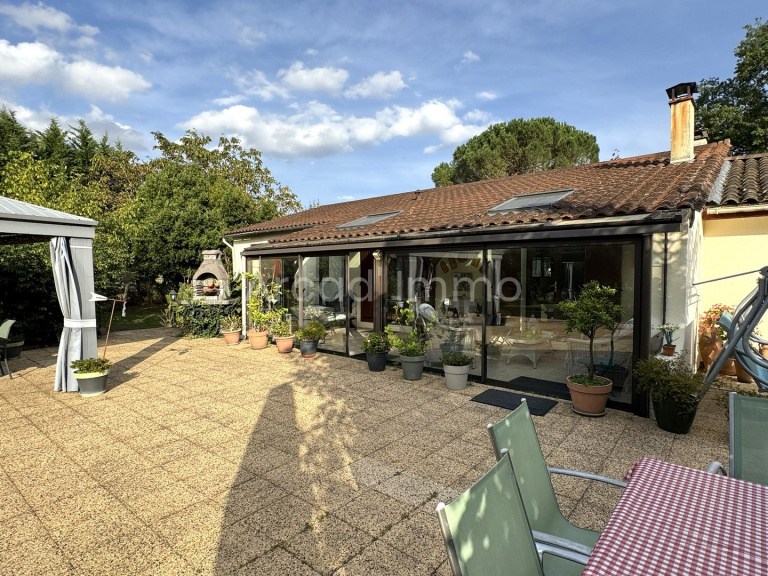 Spacieuse maison de plain-pied avec une grande terrasse et vue dans le parc arboré.