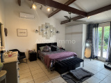 La chambre parentale avec bureau/dressing et sa salle de douche/WC (env. 40 m²). La chambre (23.5 m²) est équipée d’une climatisation réversible, carrelage au sol, une porte fenêtre donnant sur la grande terrasse et vue dans le parc arboré. Le bureau/dressing est spacieux, carrelage au sol et une fenêtre donnant sur le jardin en façade. La salle de douche est bien agencée, une douche à l’Italienne, un grand meuble avec vasque, rangement, miroir et un WC.