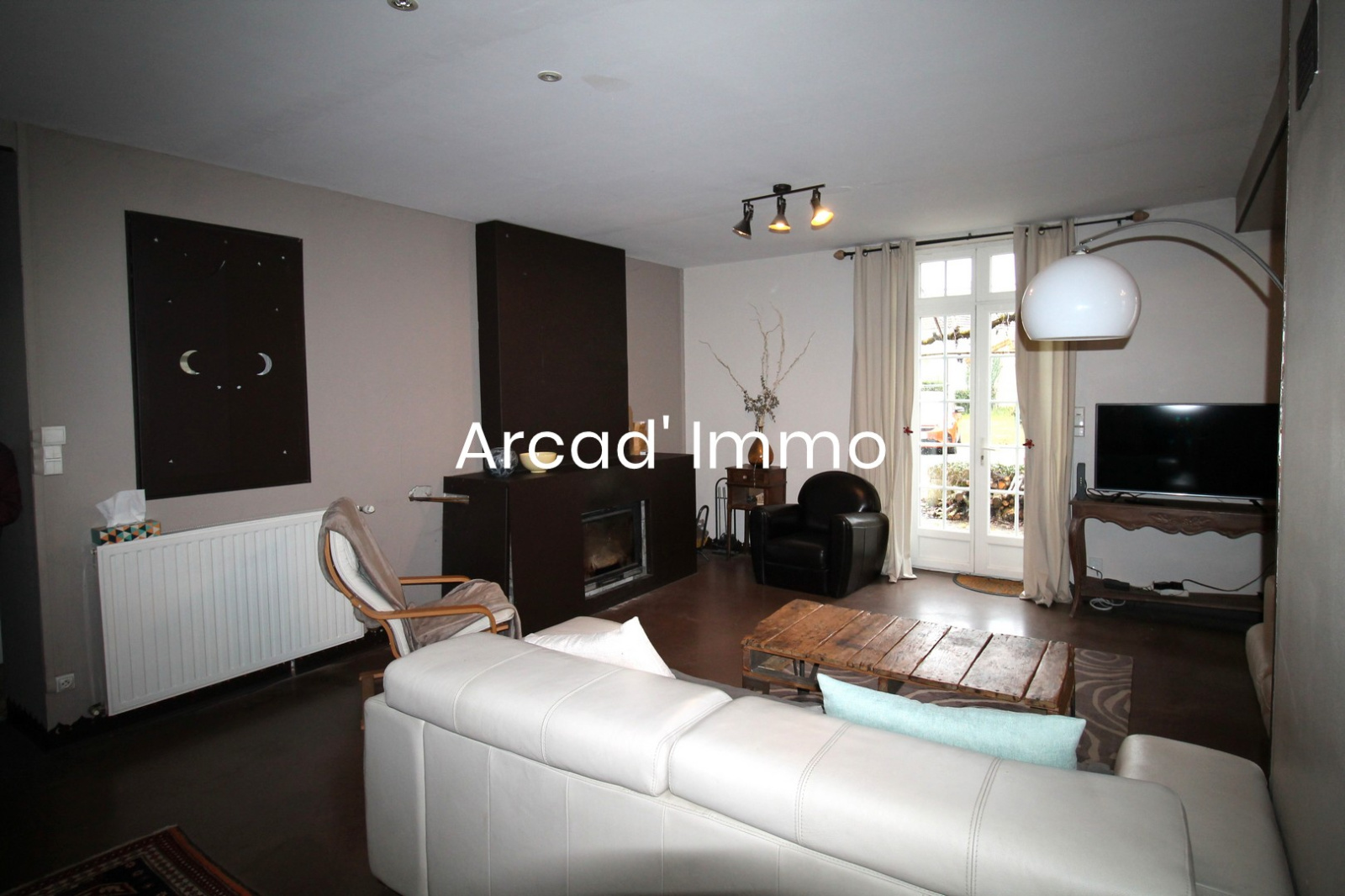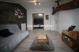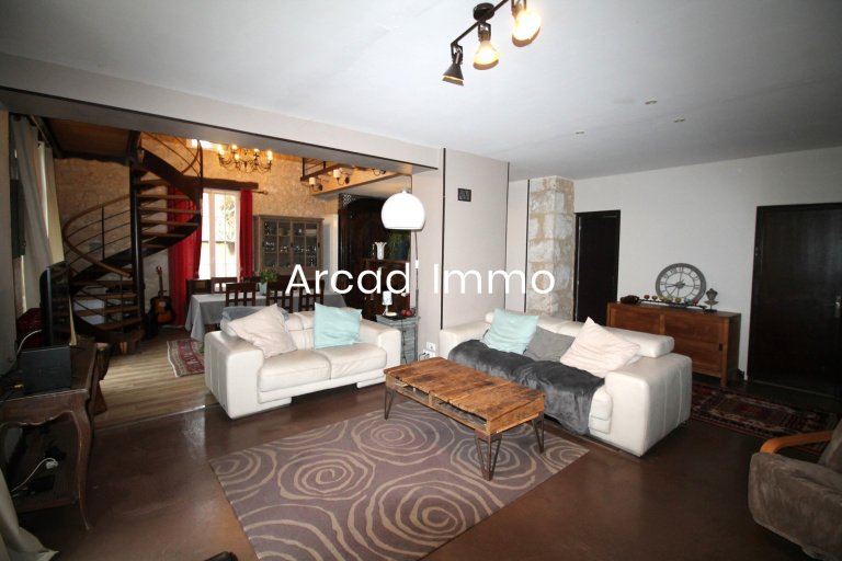 * Un séjour/salle à manger (60 m²), pour le côté salon : béton ciré au sol, une cheminée avec insert hydro, une porte fenêtre donnant sur la terrasse, un radiateur, un accès pour la cave en sous-sol. Côté salle à manger : parquet flottant au sol, pierres apparentes, une porte fenêtre donnant un second accès à la terrasse, une fenêtre, deux radiateurs, un placard, un escalier en colimaçon menant à l’étage.