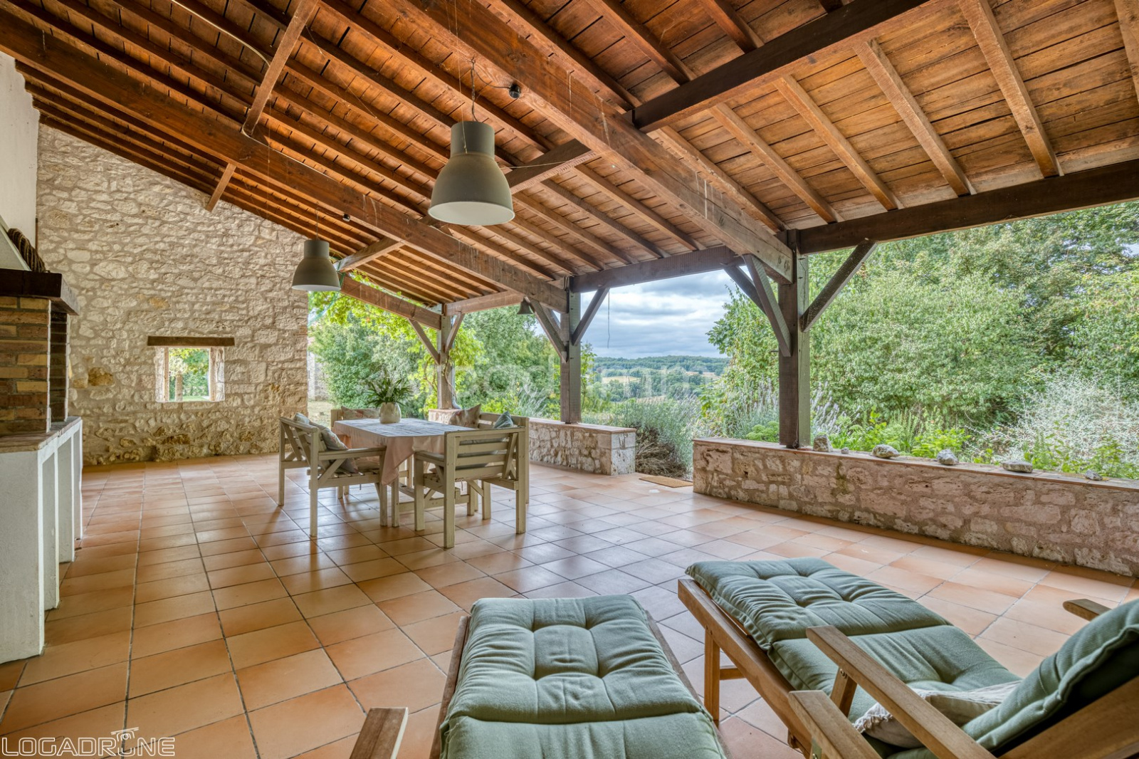 La terrasse couverte (57 m²) avec le grand barbecue et la vue dans la vallée du Dropt au loin, magnifique coucher de soleil.