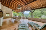 La terrasse en façade est aussi très agréable (30 m²) joli dallage, vue dans le parc, sur le bois de la propriété et au loin dans la vallée.