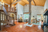 Un grand séjour (60 m²) avec son plafond cathédrale, terre-cuite au sol, trois grandes baies vitrées donnant sur la terrasse et vue dans le jardin et au loin dans la vallée : une magnifique pièce de vie pour toute la famille.
