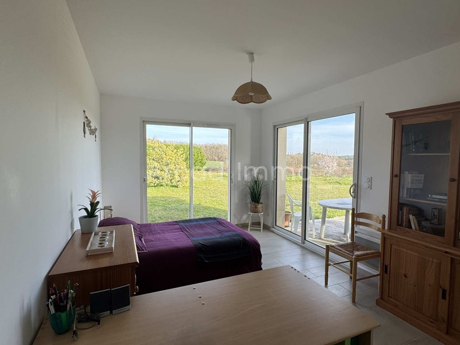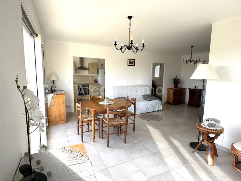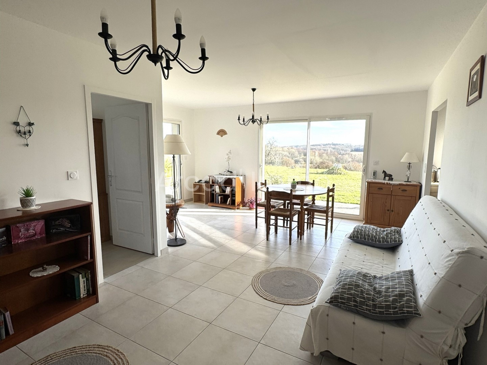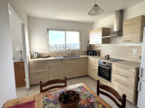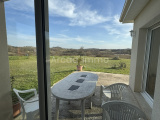 Le séjour/salle à manger (26.62 m²) est ouvert sur la cuisine (12.09 m²) carrelage au sol, une grand baie-vitrée vue dans la vallée et au loin sur les bois et le vignoble. La cuisine est entièrement aménagée et équipée, fenêtre au-dessus de l’évier et donc une jolie vue dégagée sur la campagne et les vignes au loin.