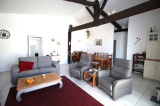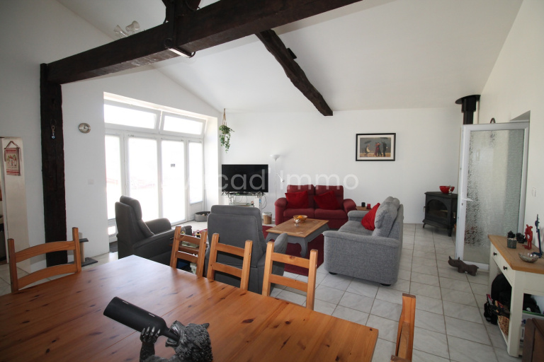 * Un séjour/salle à manger (48 m²), carrelage au sol, un poêle à bois, une baie vitrée donnant cette luminosité à la pièce.