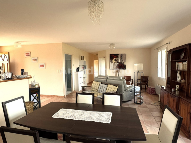 Un spacieux séjour/salle à manger avec sa cuisine semi-aménagée (46 m²) carrelage au sol, murs peints, porte-fenêtre donnant sur la terrasse et la vue dégagée dans la vallée.