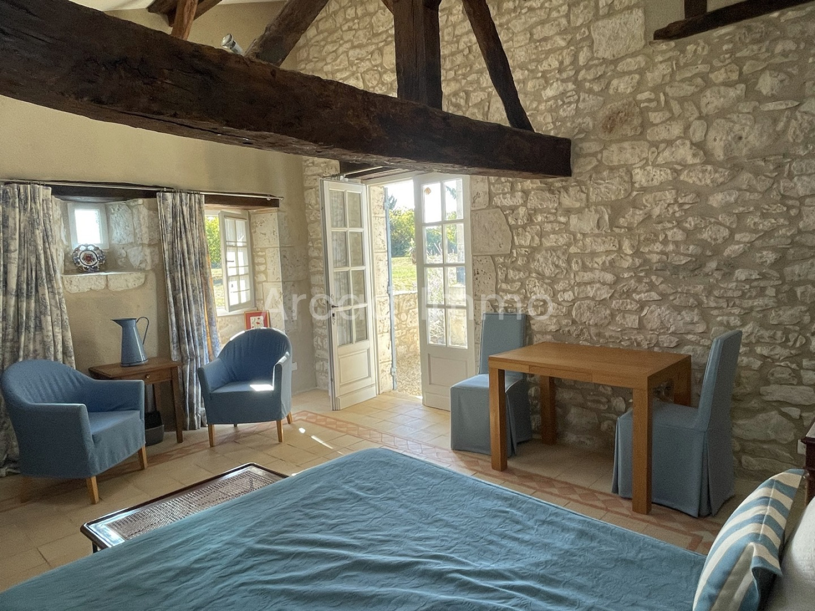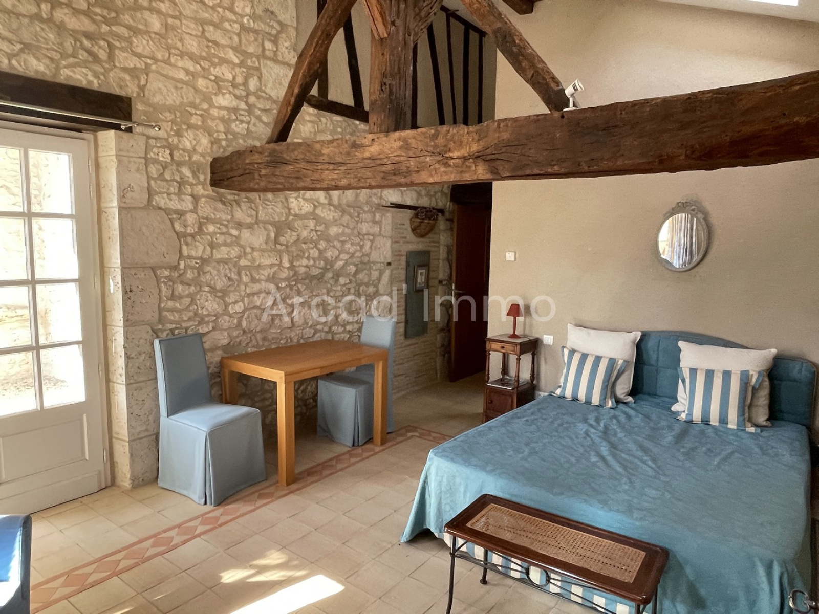 La seconde chambre (25.2 m²) avec son accès à la cour intérieure, très spacieuse avec des poutres apparentes de l’ancien grenier à foin. A l’époque, il s’agissait d’une étable.