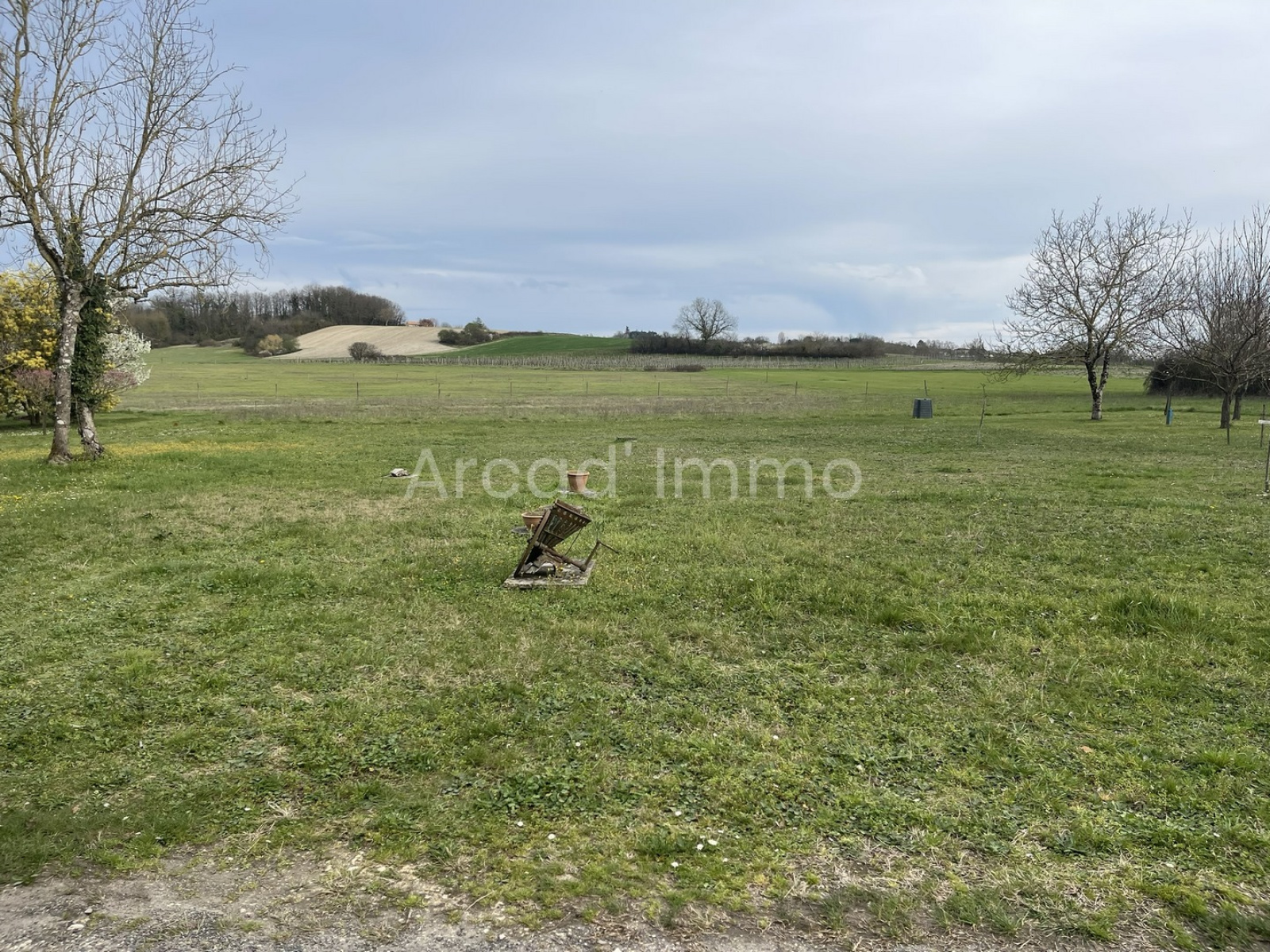 Le terrain de 1200 m² se trouve de l’autre côté de la petite route communale, rappelez-vous, le bien se trouve dans un petit hameau avec un accès par une petite route et quelques voisins.