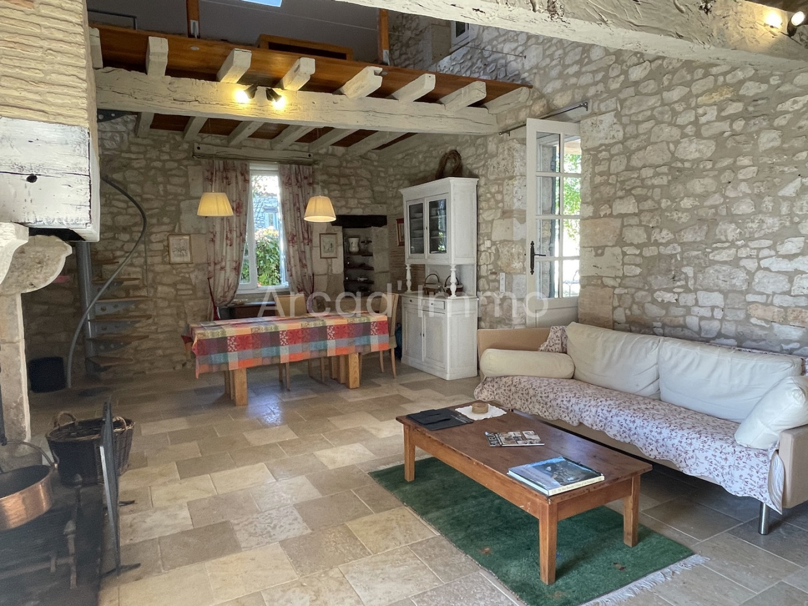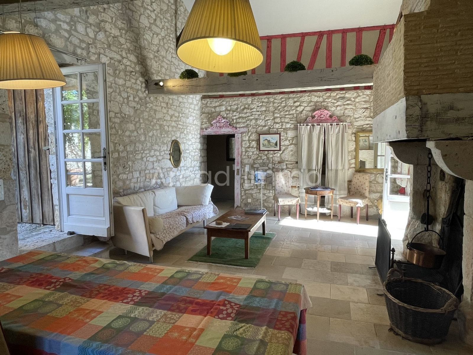 Le salon/salle à manger (33.35 m²) avec sa cheminée ouverte en bricouts et son imposante poutre en chêne. Des murs en pierres apparentes, poutres au plafond et un mur en colombage, chauffage au sol électrique, portes fenêtres double vitrage bois et volets bois, une belle hauteur sous plafond.