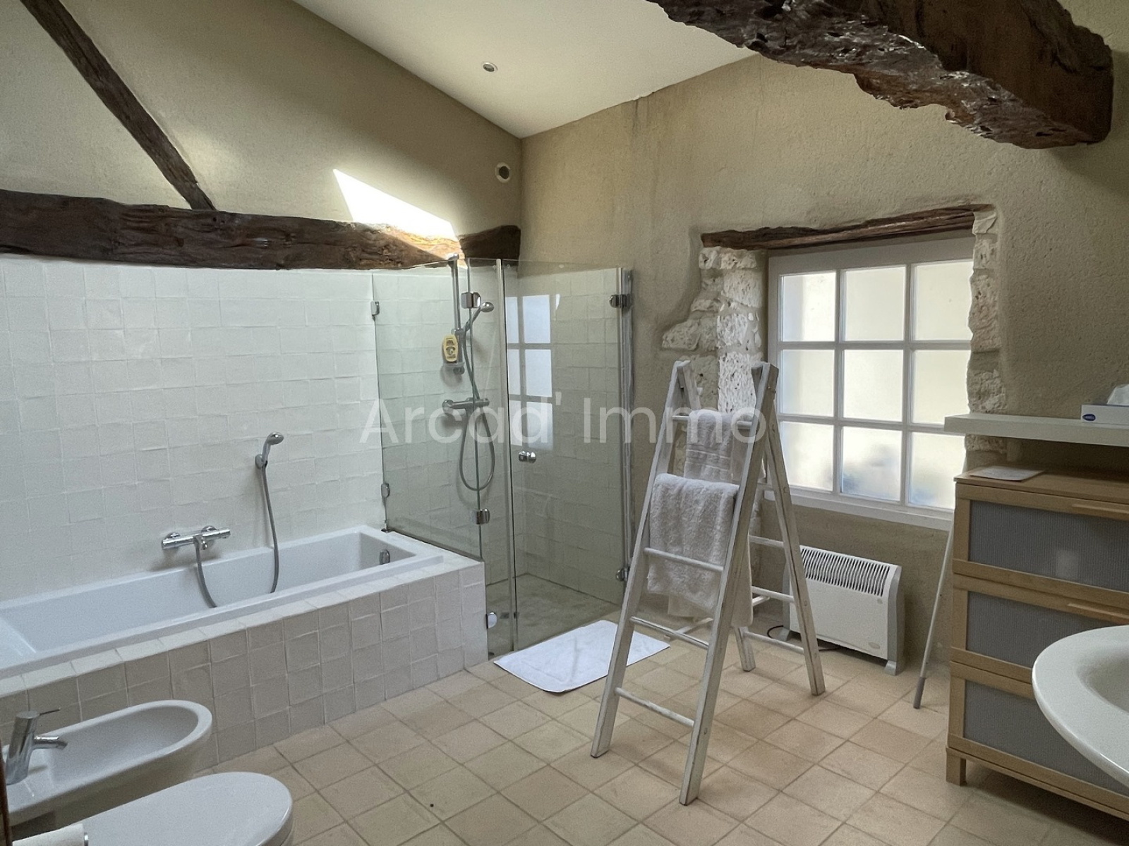 La salle de bains de cette chambre est très spacieuse et lumineuse, un grand velux au plafond et une fenêtre en brique de verre, baignoire et douche à l’Italienne, WC suspendu et bidet, un très beau lavabo termine l’ensemble.
