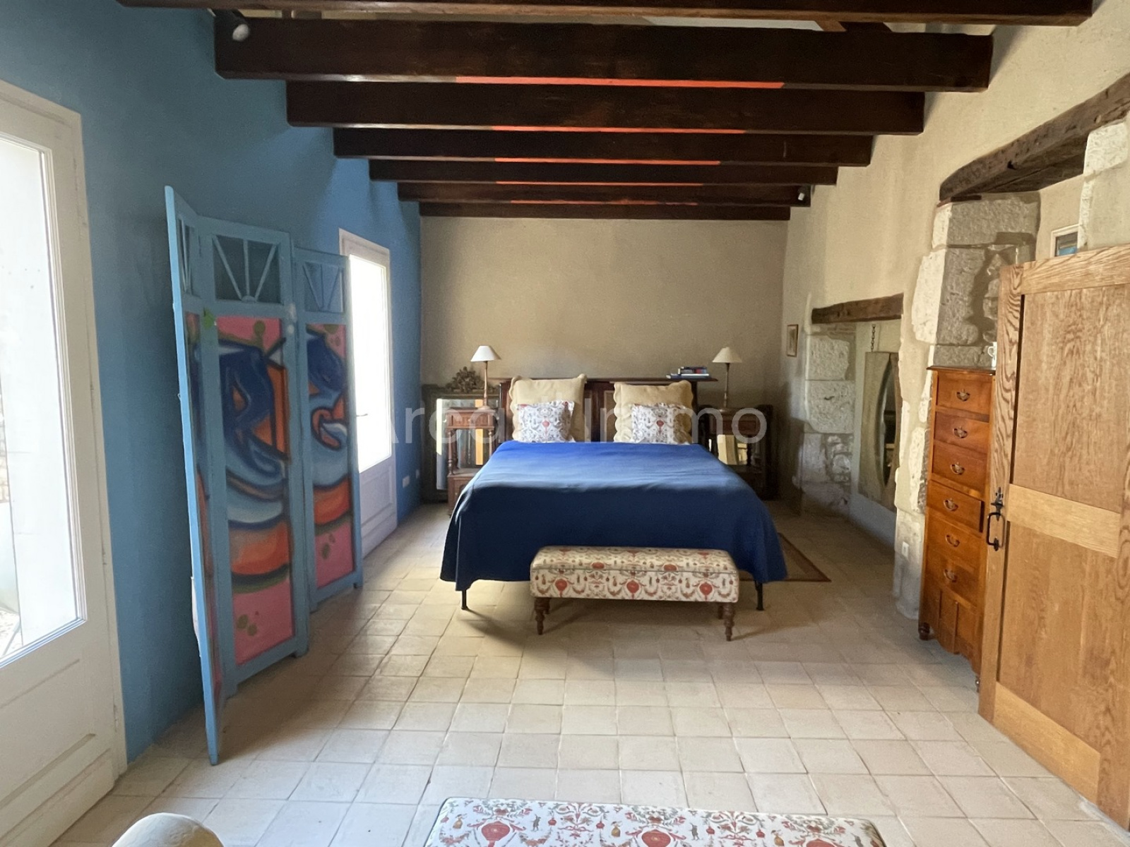 C’est une belle et spacieuse chambre avec un plafond rampant avec deux vélux, chauffage au sol électrique, murs en pierre apparentes.