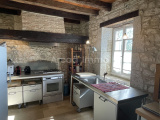 La cuisine (12 m²) se trouve au rez-de-chaussée du pigeonnier murs en pierres, chauffage au sol, travertin, porte vitrée double vitrage avec volet donnant dans la cour intérieure, poutres en chêne au plafond.