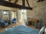 Au 1er étage dans le pigeonnier se trouve la troisième chambre (12 m²) avec une superbe charpente, des murs en pierres et un plancher en chêne massif. Un lavabo a été installé. A noter, le conduit de la cheminée de la cuisine est superbe.