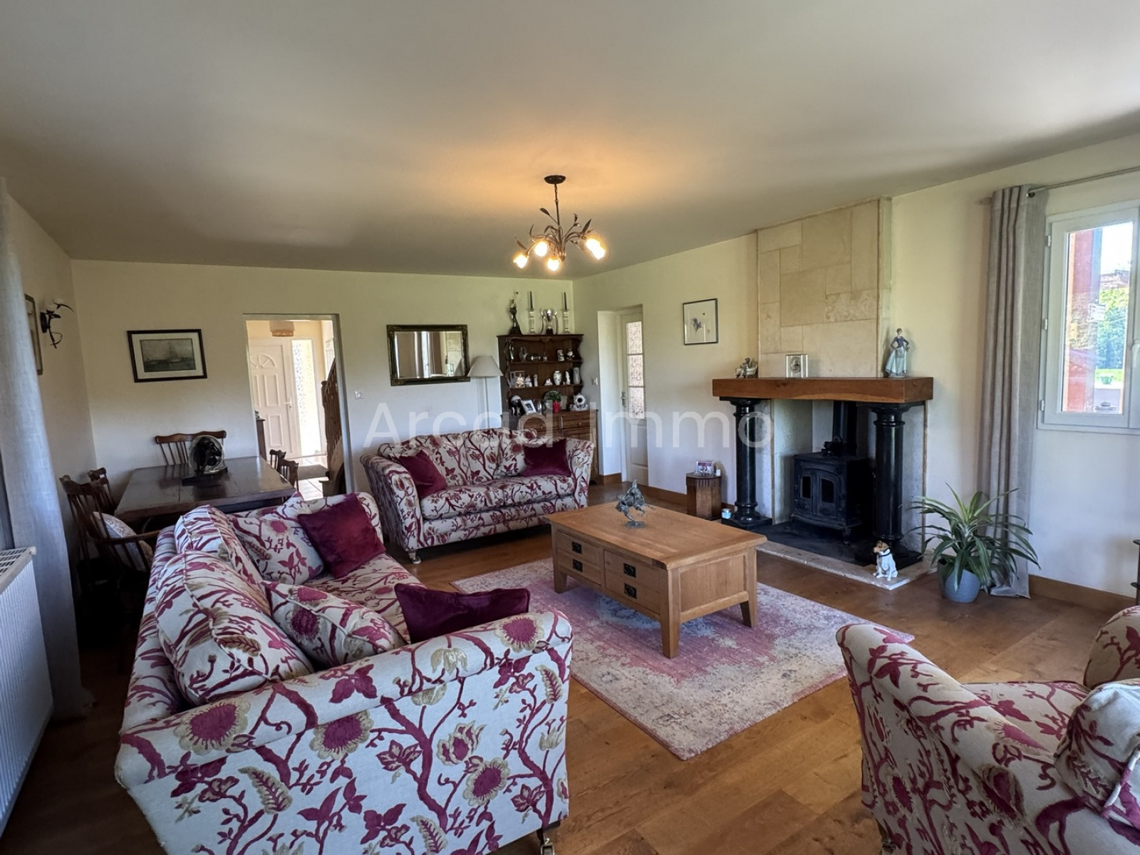 Le salon (32.2 m²) avec son poêle à bois, deux doubles portes fenêtres donnant sur la terrasse et donc sur jardin, accès à la cuisine/salle à manger, c’est une pièce carrée et surtout très lumineuse, un beau plancher bois au sol.