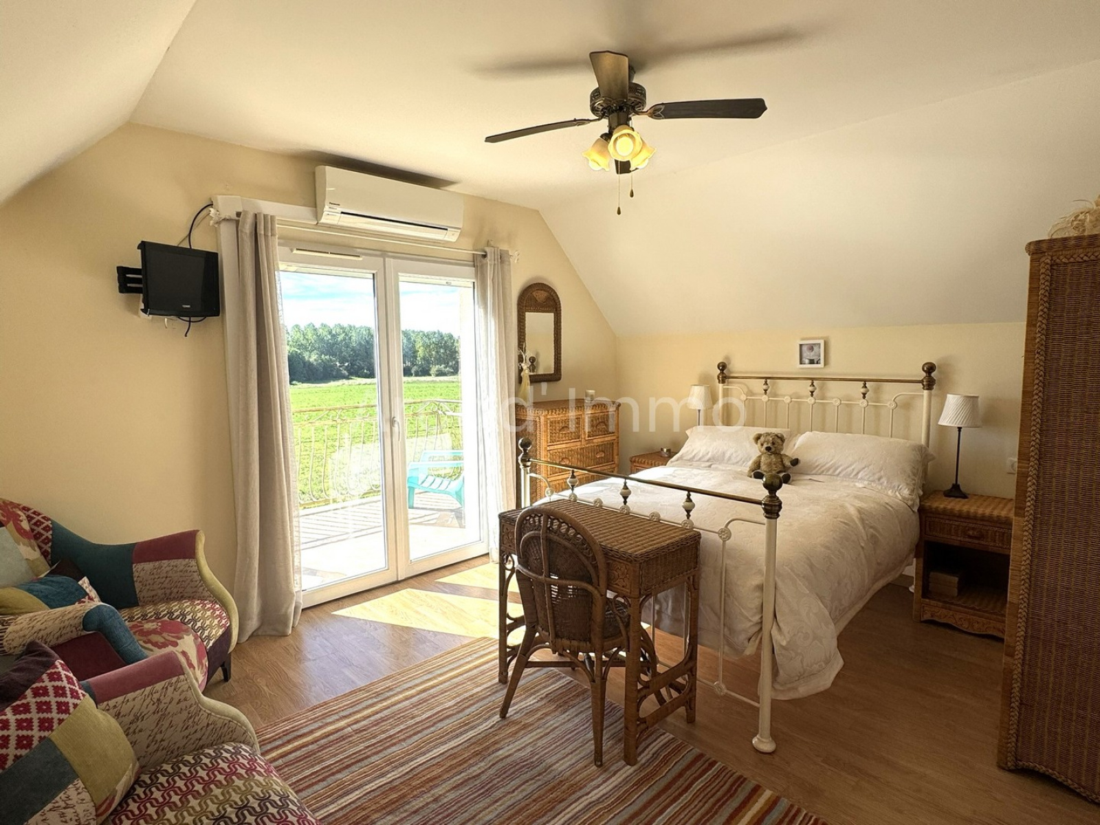 La chambre avec balcon et salle de douche/WC (20 m²), le balcon (3.5 x 1.8) est orienté à l’ouest. on peut y disposer une petite table et deux chaises afin d’observer le coucher du soleil et les animaux de notre belle campagne.