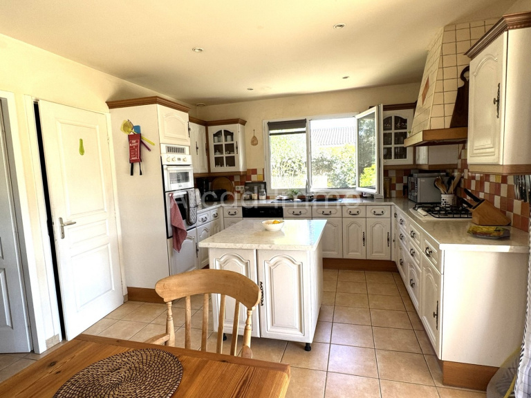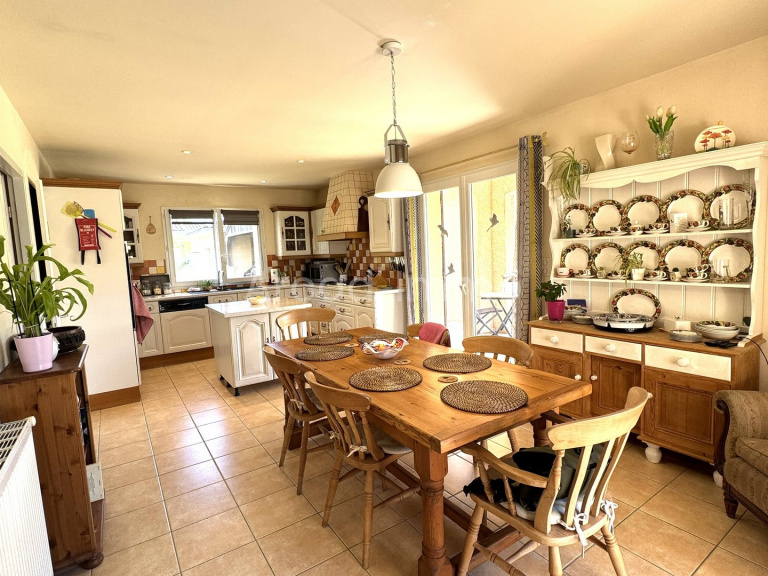 La cuisine /salle à manger (25.9 m²) carrelage au sol, porte-fenêtre donnant sur la terrasse, une porte fenêtre donnant sur l’autre terrasse côté coucher du soleil, c’est une cuisine aménagée et équipée avec une fenêtre au-dessus de l’évier.
