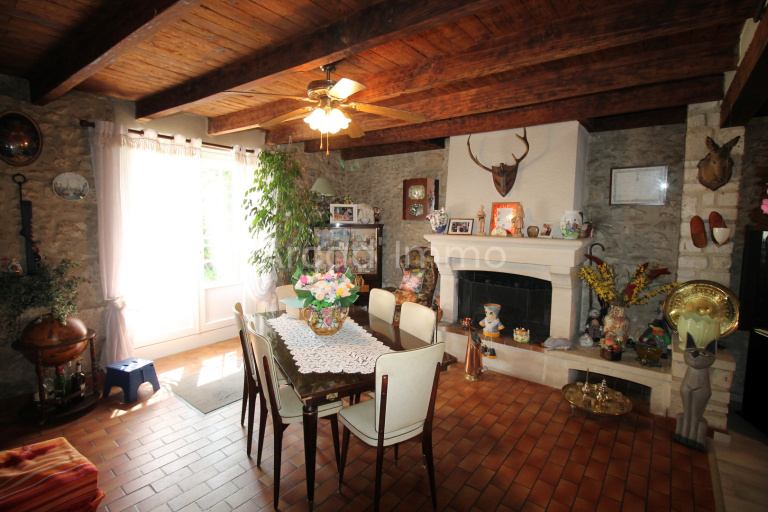 * Une salle à manger (20,87 m²), carrelage au sol, une cheminée, une porte fenêtre donnant accès à la terrasse et au jardin.