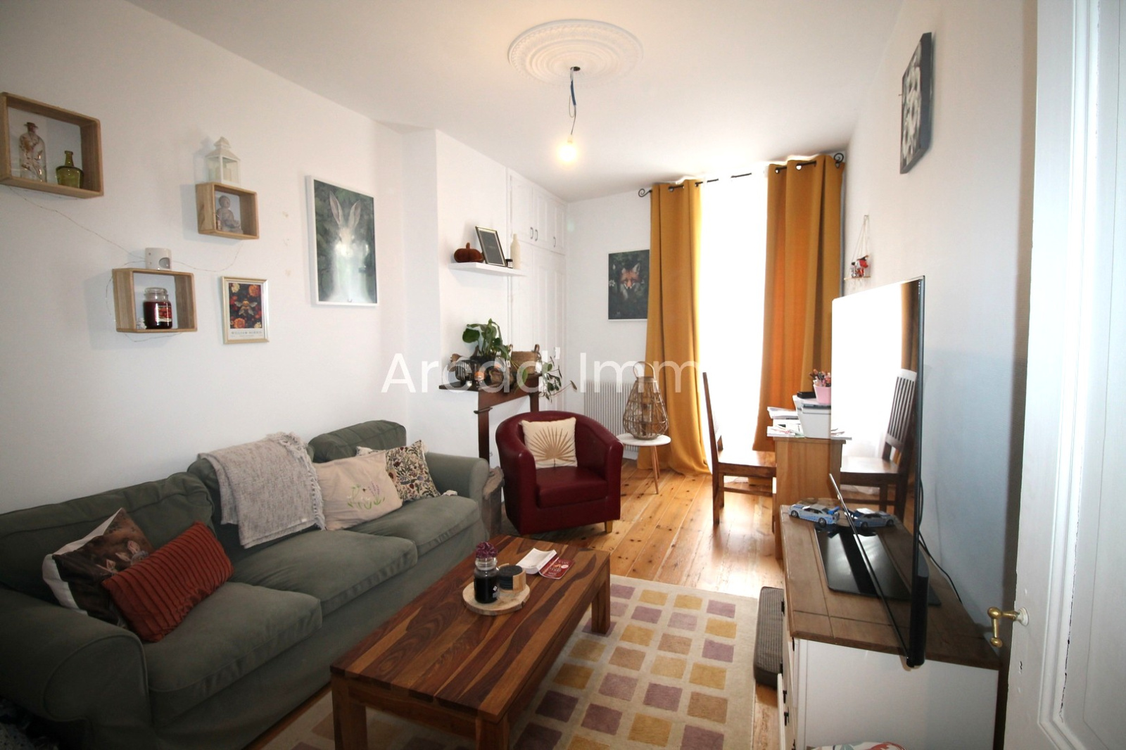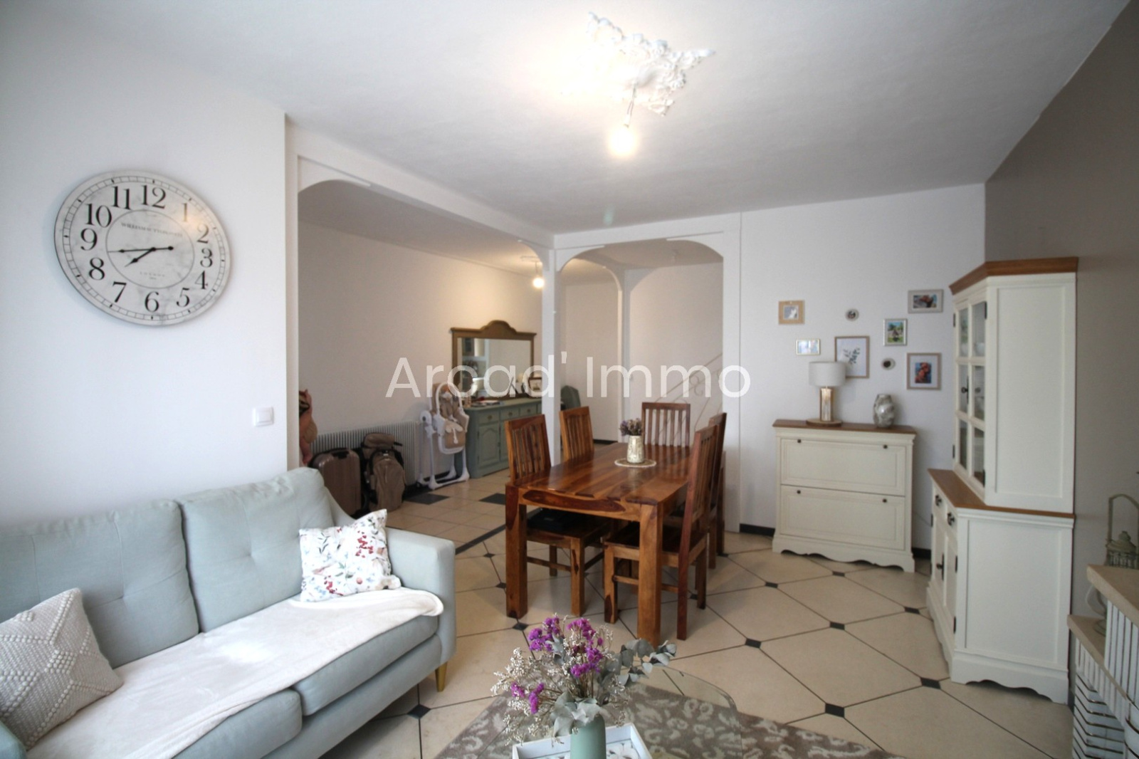 Un grand séjour/salle à manger (36 m²) carrelage au sol, cheminée (peut être tubée afin d’installer un poêle à bois).