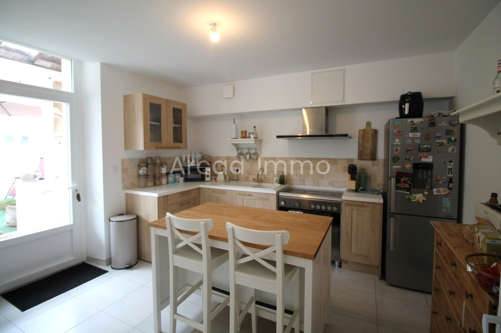 Une cuisine aménagée (12.7 m²) avec porte vers la cour intérieure et la terrasse couverte, VMC installée, carrelage au sol, accès à la buanderie/chaufferie.
