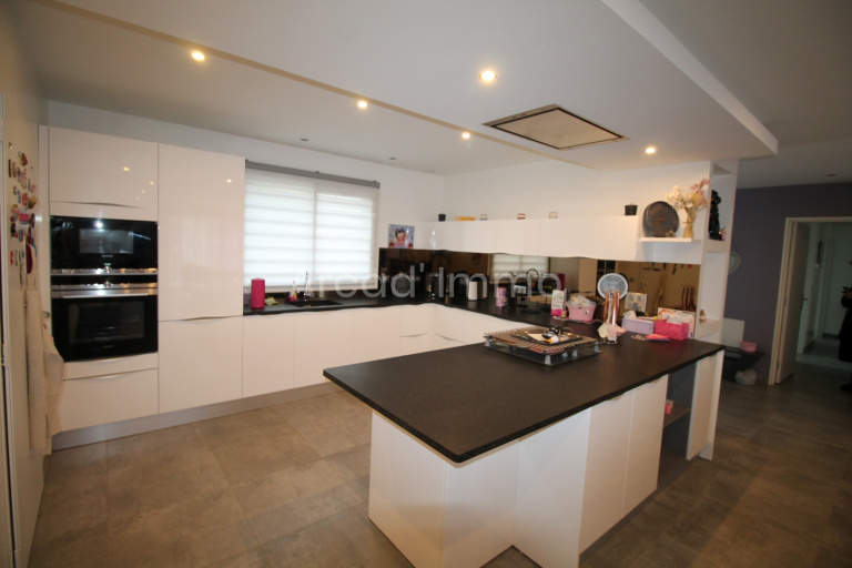 * Une cuisine ouverte sur le séjour (13,05 m²), carrelage au sol, cuisine moderne entièrement aménagée et équipée (plaques induction, hotte aspirante, lave- vaisselle, réfrigérateur, four et micro-ondes), une fenêtre.