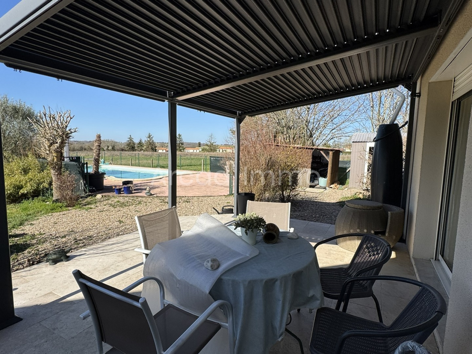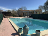 La piscine créée il y a environ 8 ans, liner et filtration au chlore et sable, avec une grande terrasse. Le local technique se trouve juste à côté.