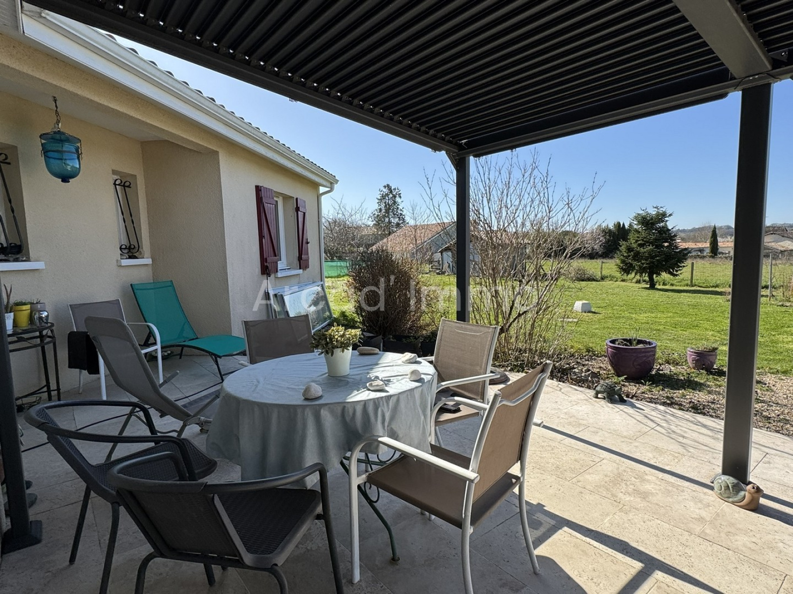Une spacieuse terrasse couverte et carrelée, cette terrasse est située à l’ouest et donc une très agréable vue sur la campagne avec le coucher de soleil.