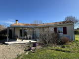Un grand séjour/salle à manger ouvert sur la cuisine entièrement aménagée (45 m²), carrelage au sol, poêle à bois et climatisation réversible, baie-vitrée avec volet roulant et porte-fenêtre double vitrage PVC et volets bois. La cuisine est équipée de nombreux tiroirs de rangement, une plaque au gaz (bouteille) et un grand plan de travail sur les deux côtés, fenêtre face à l’évier.