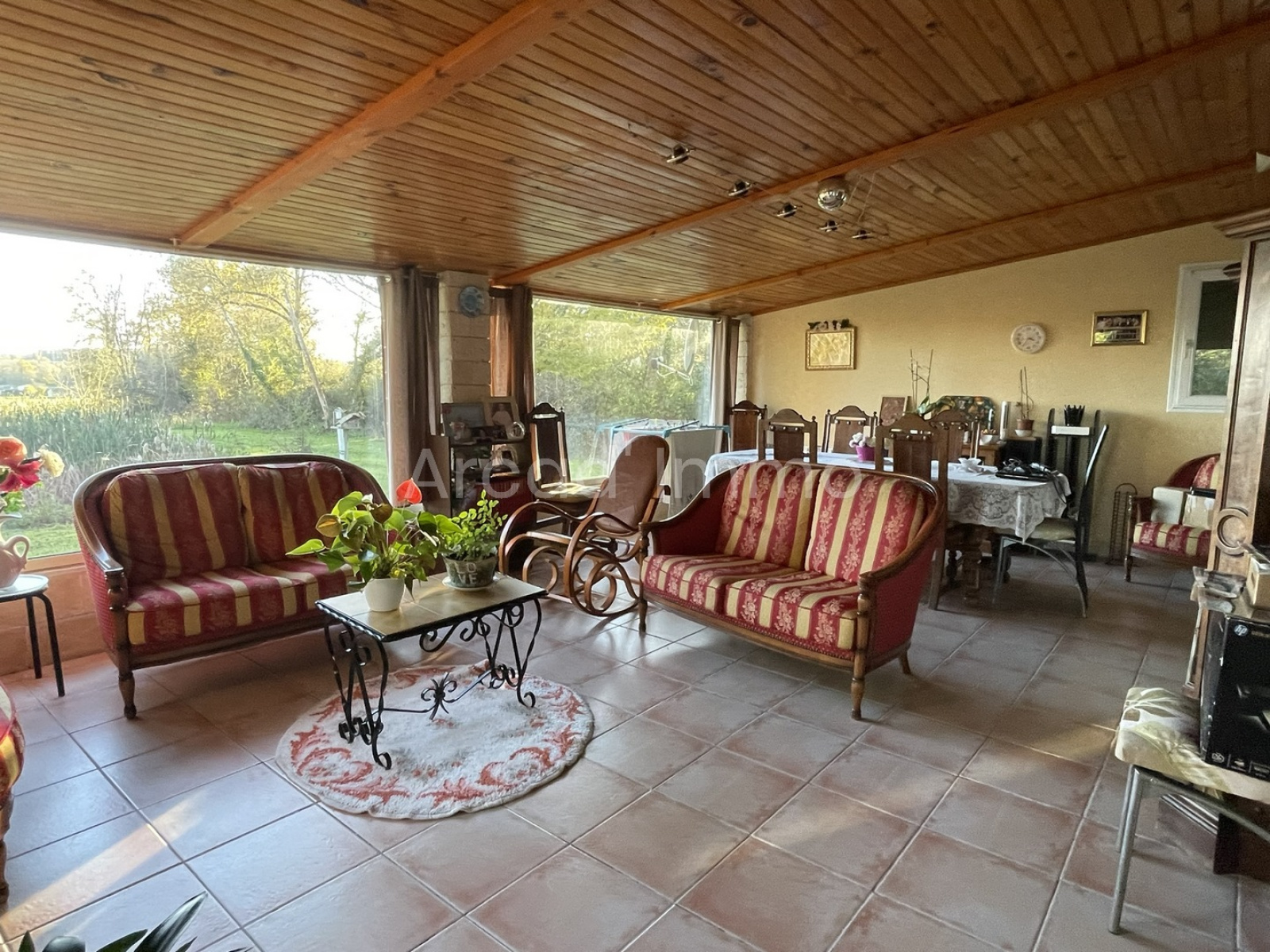 Une véranda (30 m²) carrelage au sol, baies vitrées double vitrage, accès à la terrasse en bois, pas de chauffage, vue au loin sur le petit étang et les champs de blé, maïs et tournesol.
