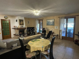 Un spacieux séjour/salle à manger/cuisine (46 m²) carrelage au sol, cuisine semi-aménagée/équipée, chauffage par la cheminée/insert uniquement, double vitrage bois et volets bois.