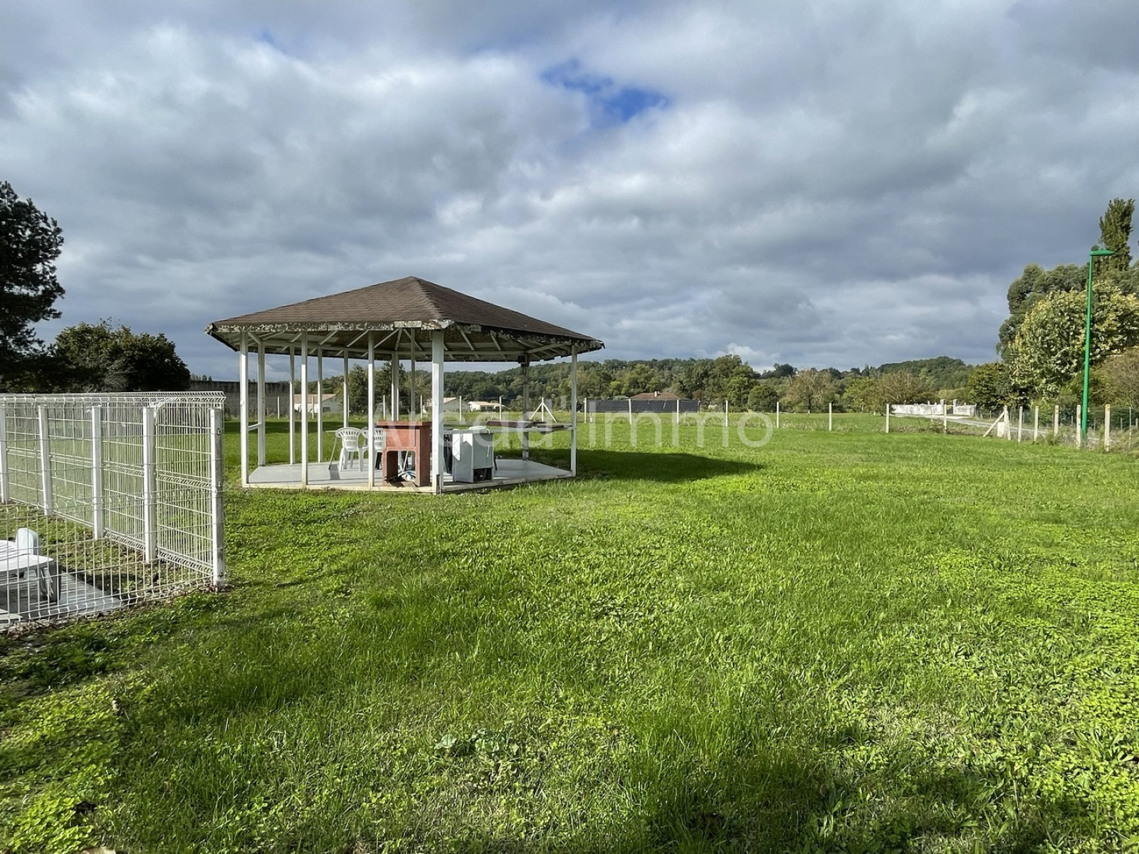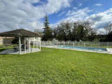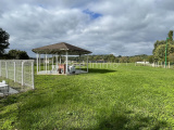 De l’autre côté de la toute petite route se trouve le terrain avec sa piscine et terrasse couverte/kiosque.