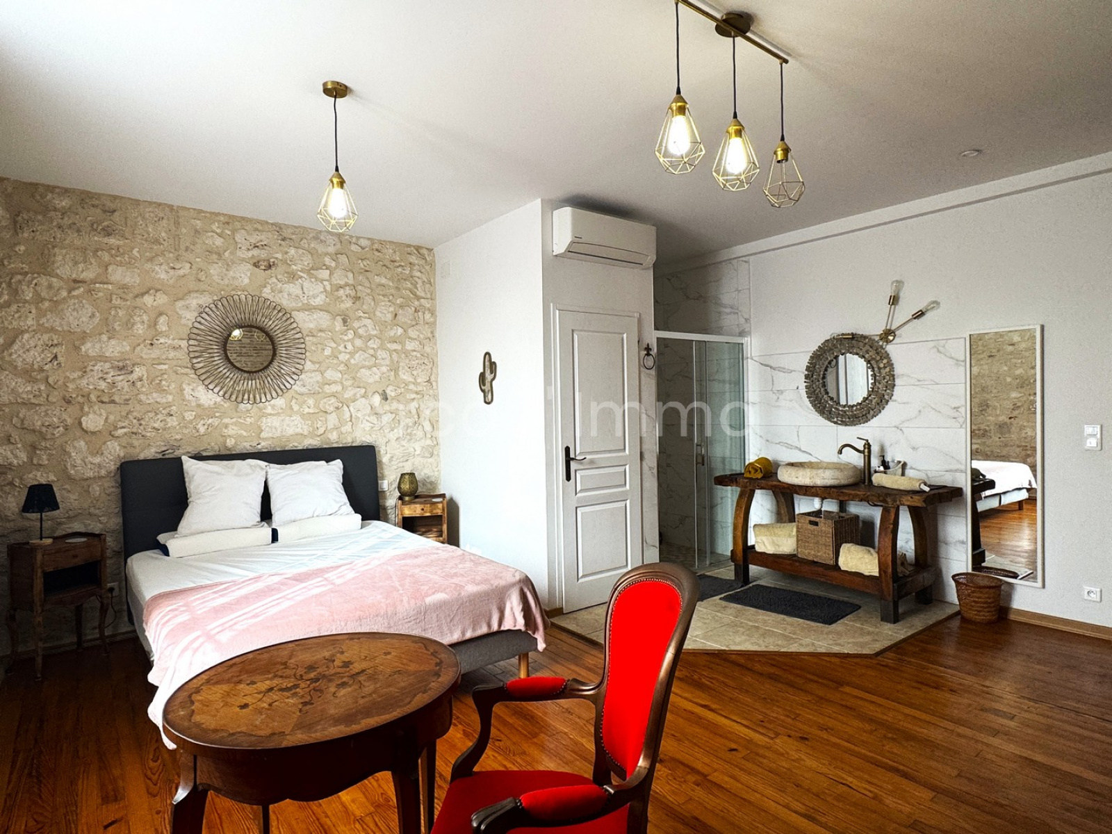 Un élégant escalier en bois mène à un palier desservant deux grandes chambres (25,7 m² et 29,8 m²), chacune avec salle d’eau moderne, toilettes, murs en pierre et colombages apparents, climatisation réversible et superbes vues sur le village ou la cour. Le charme de l’ancien se mêle au confort moderne.